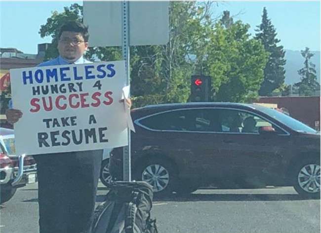 2018年07月31日近日美國加州一名路人站在安全島,舉著求職標語的照片在網路上瘋傳,「無家可歸,渴望成功,附帶履歷」短短的幾行字竟成為了一個完美的求職策略,到第二天他就收到了200多份工作的面試機會。