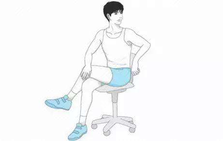 做法:坐在椅子上後上半身打直,左腿放在右腿上,右手放在左腿的膝蓋部位,左手自然的放在身後,頭轉向左邊,用右手將左腿往右邊推,直到感覺腰部有拉伸感為止,停留5至15秒後回到預備姿勢,換邊進行。
