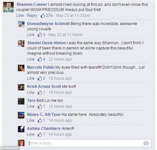 這張照片很快吸引了兩萬五千個讚和大量的分享,這對新婚夫妻完全沒有想到他們會受到這麼多關注。迦勒說:「希望我們對彼此的愛能夠激發一些人。我們很感謝這張照片能夠祝福這麼多人,並觸動到他們的心。」