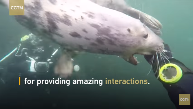 2018年09月26日潛水員丹·帕特森(Dan Patterson)在英國法恩群島經歷了一次有趣的浮潛,他一位水下攝影師的朋友拍下他和灰海豹嬉戲的場景,畫面非常有愛。