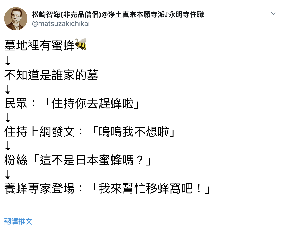 ▼日本九州「永明寺」的墓園出現大量蜜蜂,讓參拜民眾擔驚受怕,因此告知住持,希望廟方解決。無計可施的住持只好上推特訴苦,卻被網友點出那是珍貴的原生種「日本蜜蜂」,後來更有養蜂專家自告奮勇幫忙處理。
