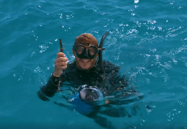 ▼成功移除魚鉤後,Jake再一次下潛,與等在那裡的Freckles擁抱。他與Freckles告別,在心中默念:「再見,以後要保重!」