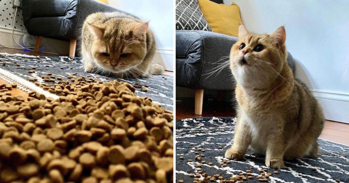 鏟屎官不小心打翻貓糧 小胖貓吃驚「O型嘴」興奮了:幸福來得太突然