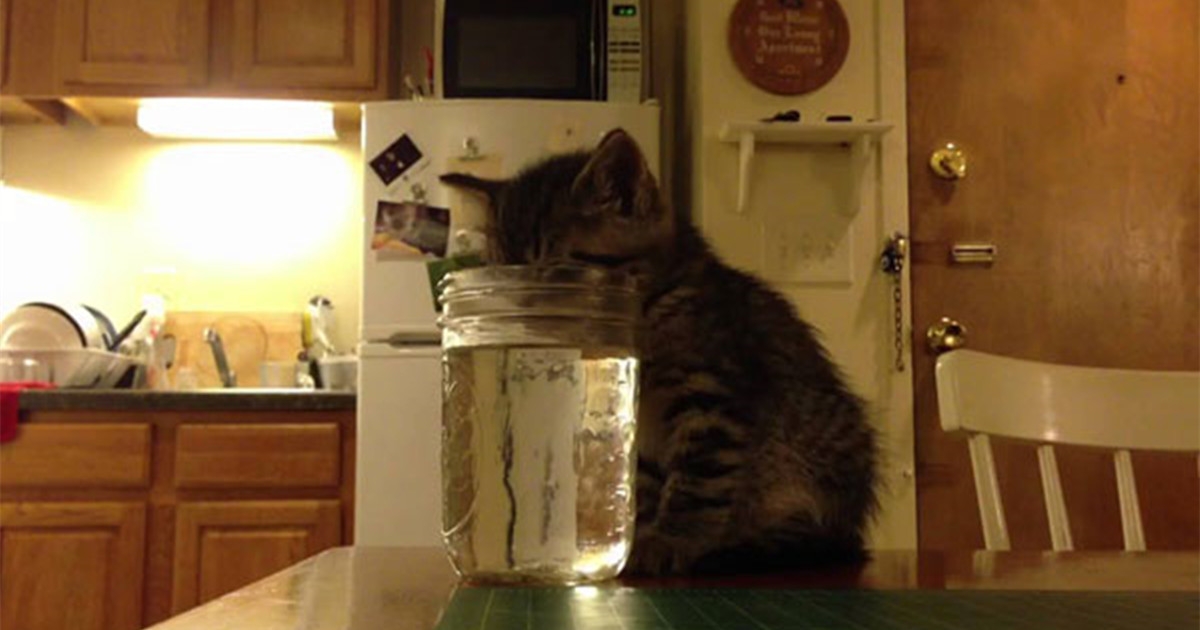 小貓頭伸進水瓶裡一動不動 主人擔心走近查看卻一秒笑噴
