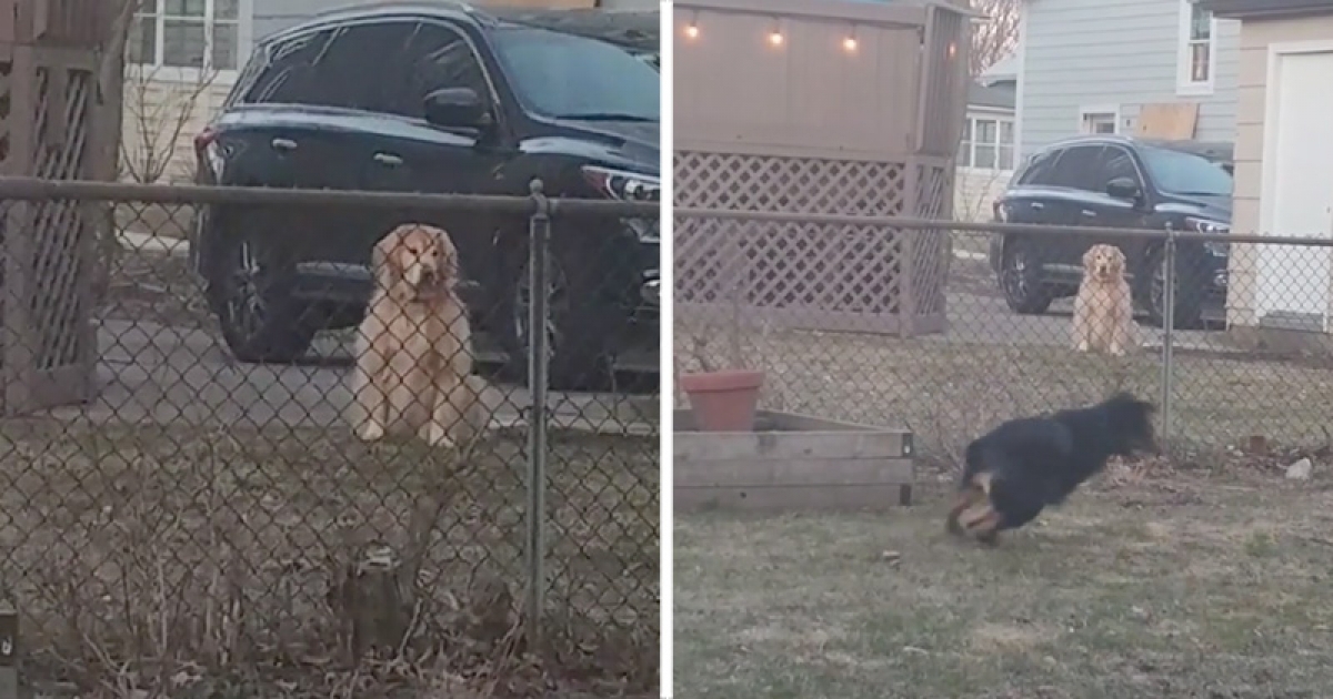 「我也想一起玩…」 金金超哀怨看著鄰居家的汪開心玩球球