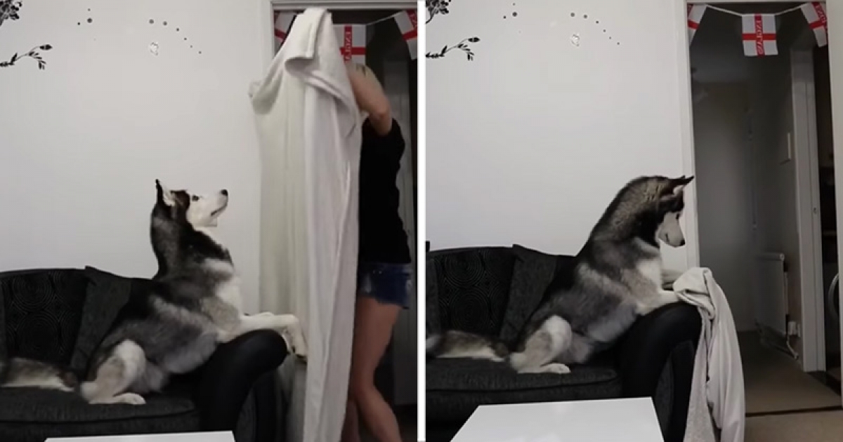 女主人用毛巾表演魔術「瞬間消失」 月月大腦當機:我的馬麻咧?
