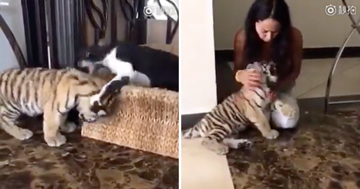 小老虎想親近喵皇反被呼巴掌 忙跑回馬麻身邊討拍:「人家怕怕~」