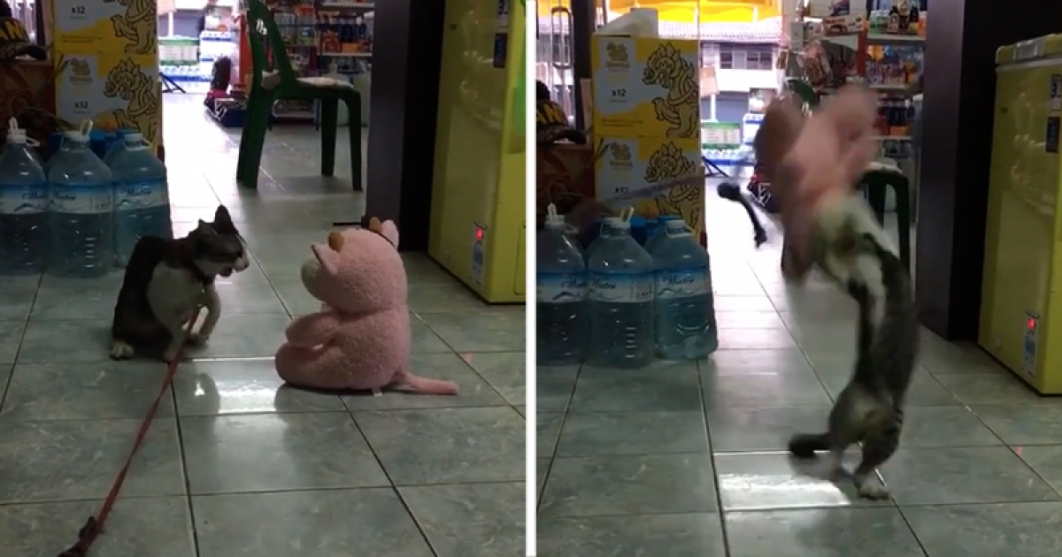 大膽娃娃擋著貓皇的路 牠一個「神過肩摔」全網驚叫