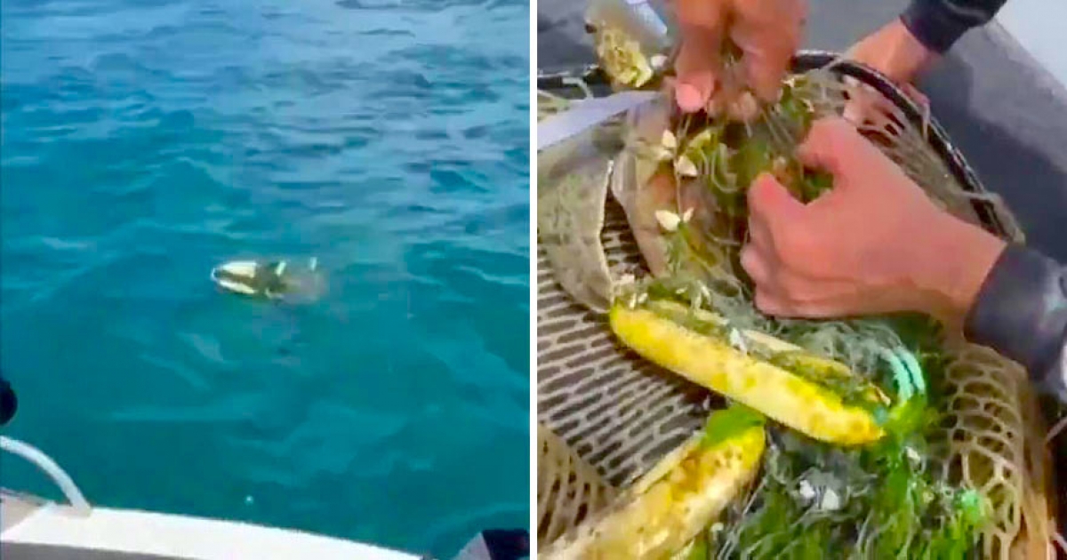 小海龜海上無助漂流! 3漁夫「看出不對勁」解救:全身都被垃圾纏住了…