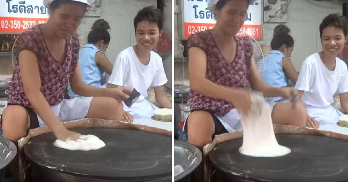曼谷女攤主拿米糊在鐵板上畫一個圈 一抬起來超強神技讓網友直呼匠人藝術