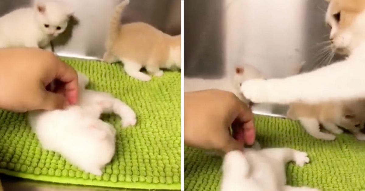 「請你不要這樣好嗎…」 貓媽媽伸手阻止奴才亂玩小奶貓