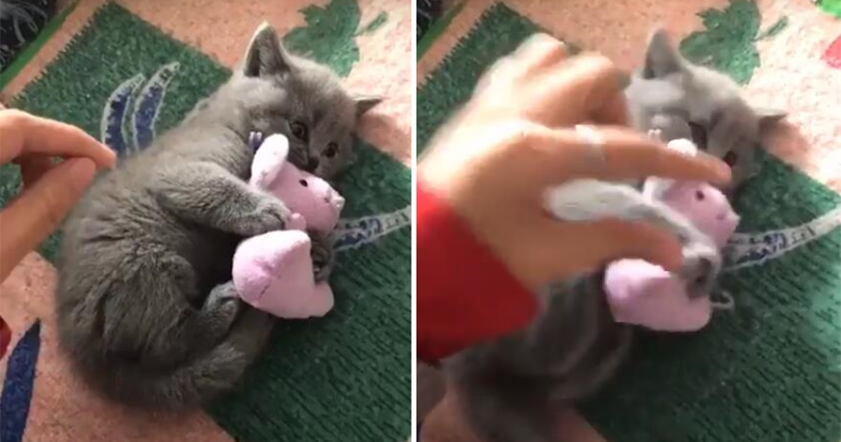 小灰貓緊抱粉紅娃娃主人來偷拿 氣噗噗狠踹死守:「不准搶我朋友」