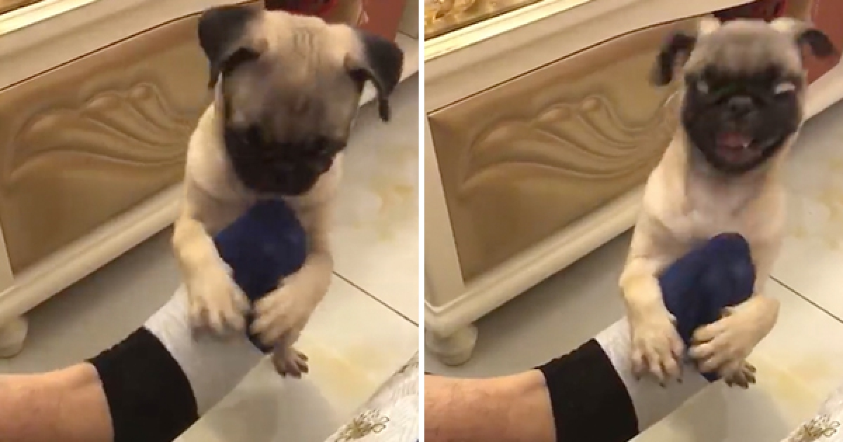 巴哥抱主人「酸菜味」臭腳狂聞 下秒大翻白眼:已升天~