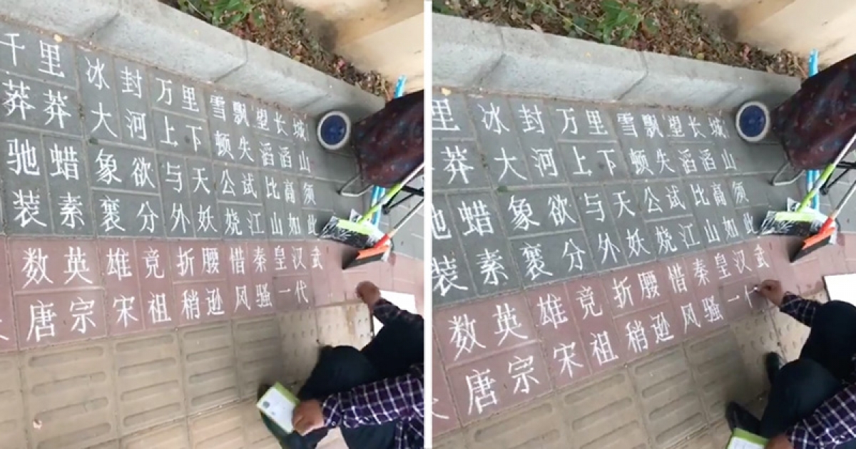 民間高手在街頭展示「神之手」 粉筆字工整到不可思議