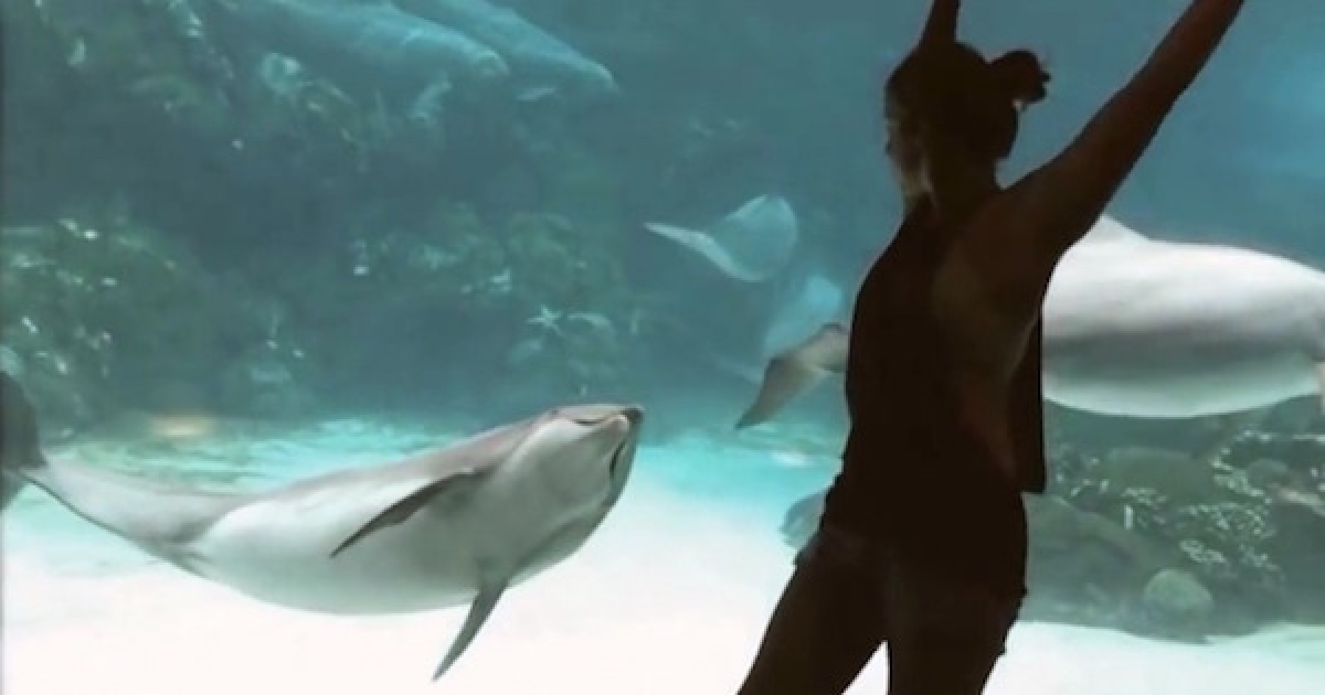 她在水族館對海豚翻跟斗 海豚歪頭看...「哈哈哈」開始大笑