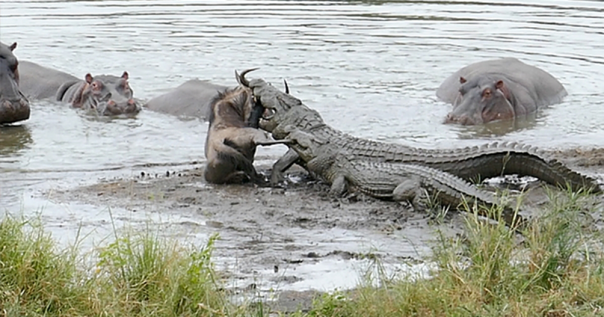 眼看牛羚就要被鱷魚吃掉 下一秒河馬神救援打趴鱷魚