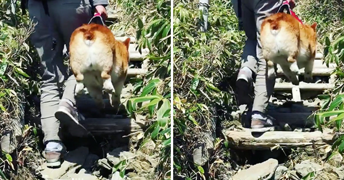 主人提「渾圓屁屁柯基包」上坡 近看才發現是隻「偷懶柯基」