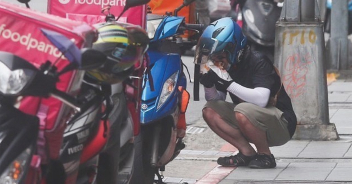 脫口罩會被公審! 外送員蹲路邊「囫圇吞漢堡」眾人全鼻酸