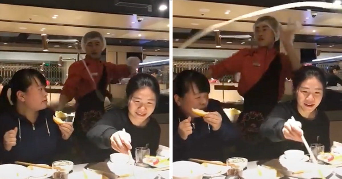 師傅表演「甩麵秀」失手 麵條竟神準貼在馬尾妹臉上