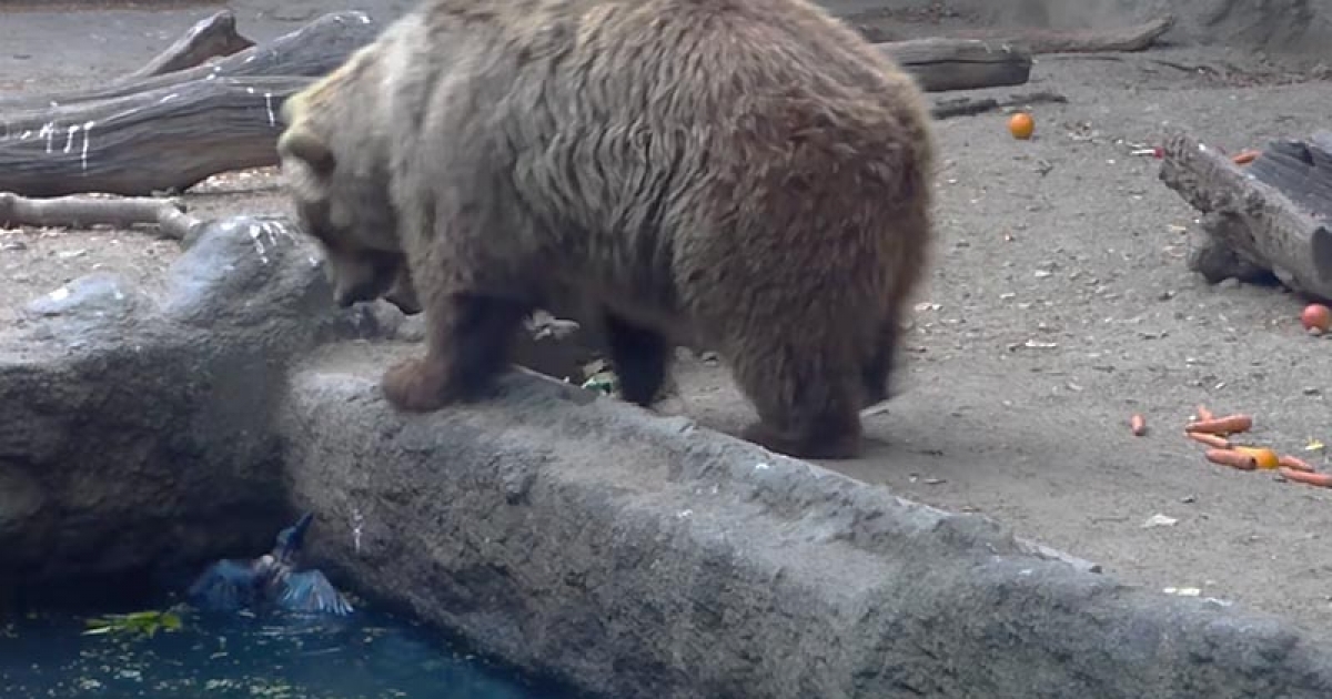 遊客都懷疑自己的眼睛 超暖灰熊居然伸掌撈起掉進水裡的烏鴉