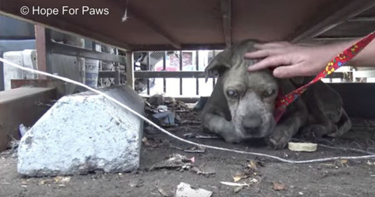 失明的比特犬浪浪一直等著好心人救牠 某天牠終於等到有人慢慢靠近
