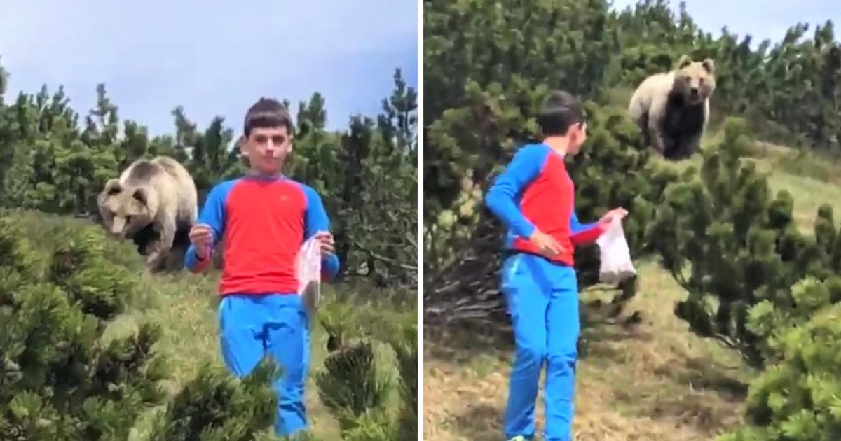 踏青背後冒出一隻熊! 12歲弟「太空漫步式」淡定臉下坡:真的不用理我沒關係…