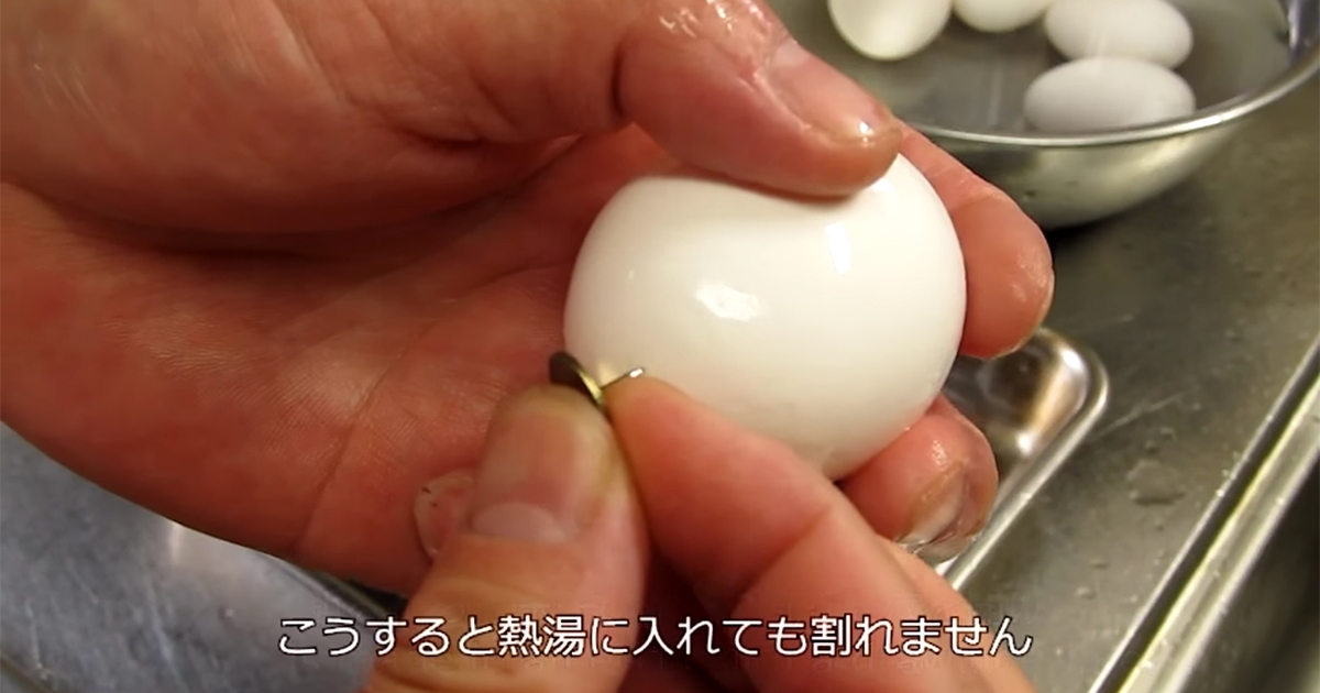 用圖釘在生雞蛋上戳了兩個小孔 最後做出令人垂延欲的完美溏心蛋