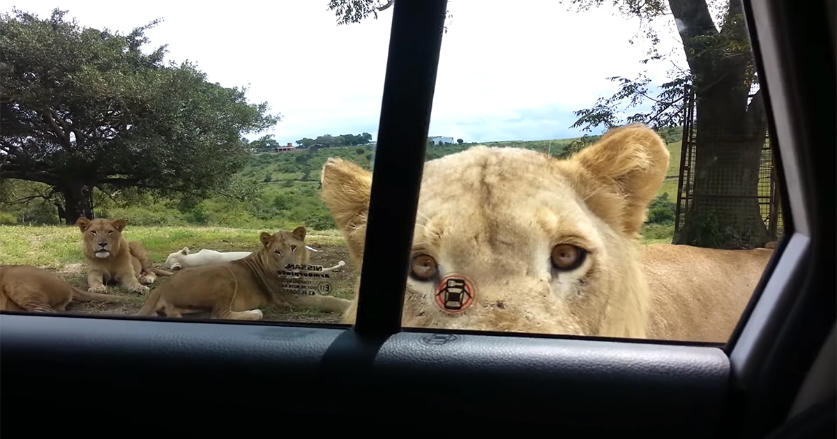 「牠會開門!」 一家人在車裡近距離欣賞獅群 突然門打開女孩被嚇瘋