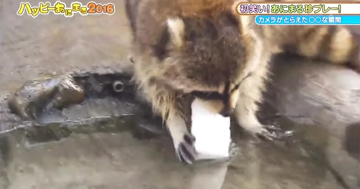 小浣熊吃棉花糖照慣例要清洗 當牠放入水中… 呆愣的表情可愛到炸掉