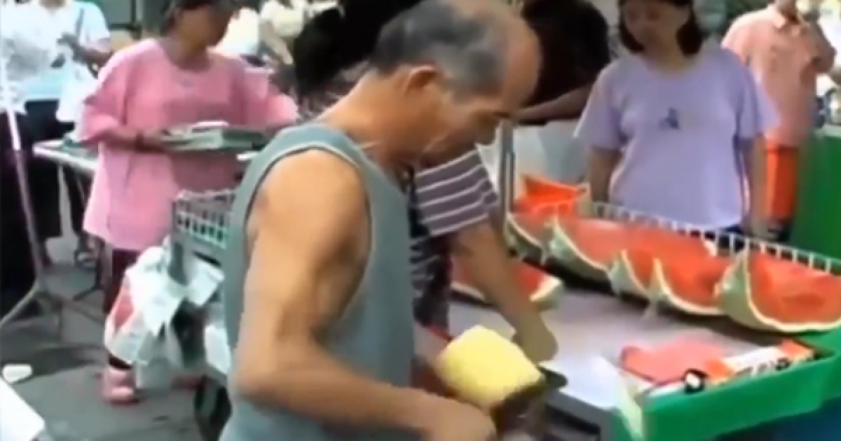 水果攤阿伯根本開外掛啊! 一開始切鳳梨不用刀 手法嫻熟讓網友跪了