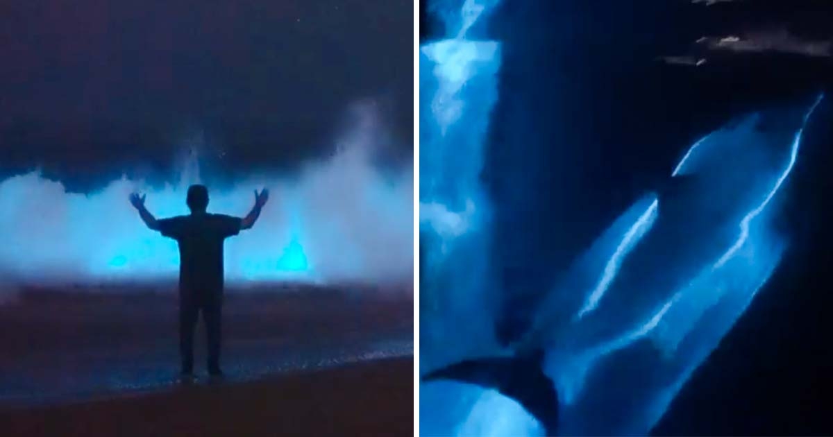 是在拍電影? 他拍下罕見「絕美螢光藍」浪潮 海豚「藍光海中悠游」:畫面太動人~