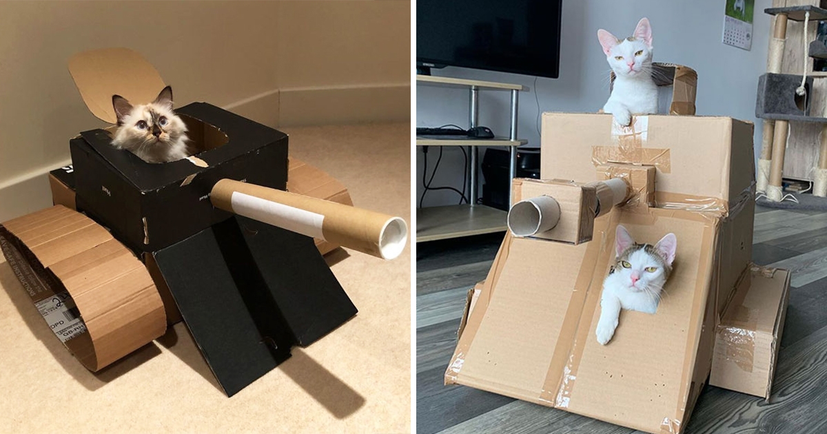 隔離中太閒!貓奴流行造「紙箱坦克」 喵皇超賞臉:快叫我將軍~