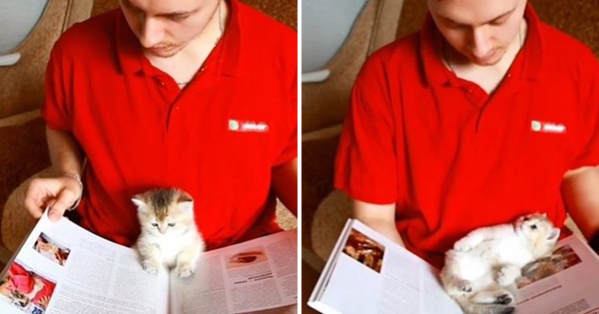 「我比書更好看咪~」 陪讀小奶貓躺倒露肚肚 露出「水汪汪眼神」想討摸摸