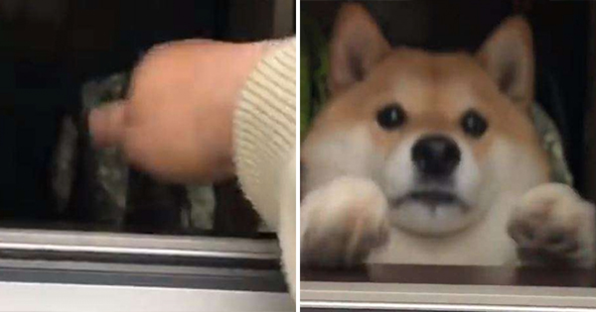好奇敲一下窗戶… 一隻柴柴探頭打招呼 無辜臉看著陌生人:你找我嗎?