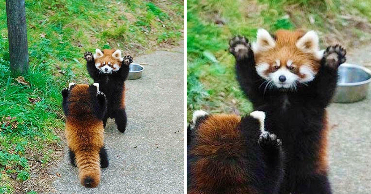 小熊貓裝兇「舉手手嚇同伴」 網忍不住笑:牠很認真在賣萌