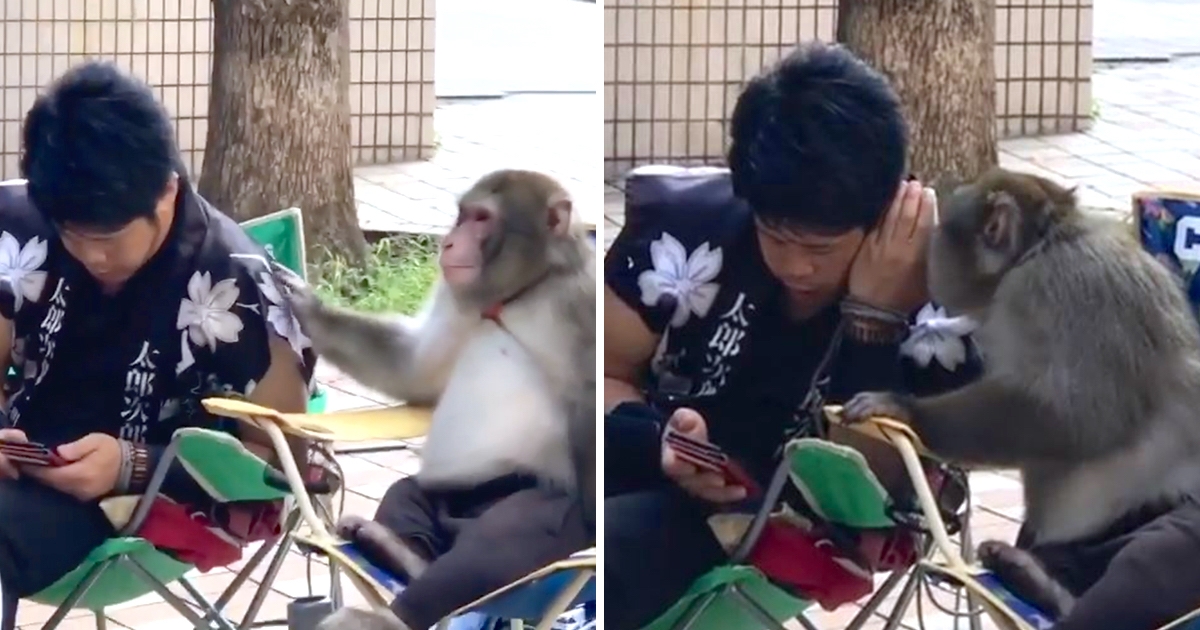 哩咧跨啥?猴子拍肩想看手機 兩個還「湊耳朵講悄悄話」網看呆:超級哥倆好