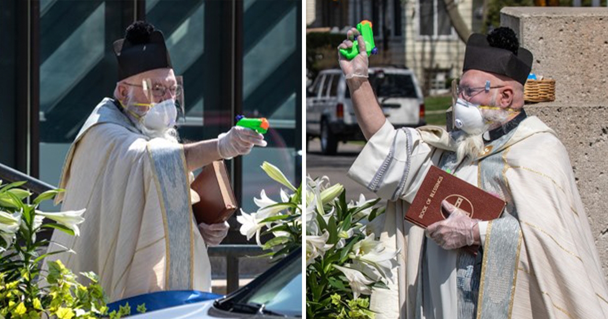 嚴守社交距離! 超可愛牧師「用水槍噴聖水」 隔信徒2公尺:接受祝福吧~