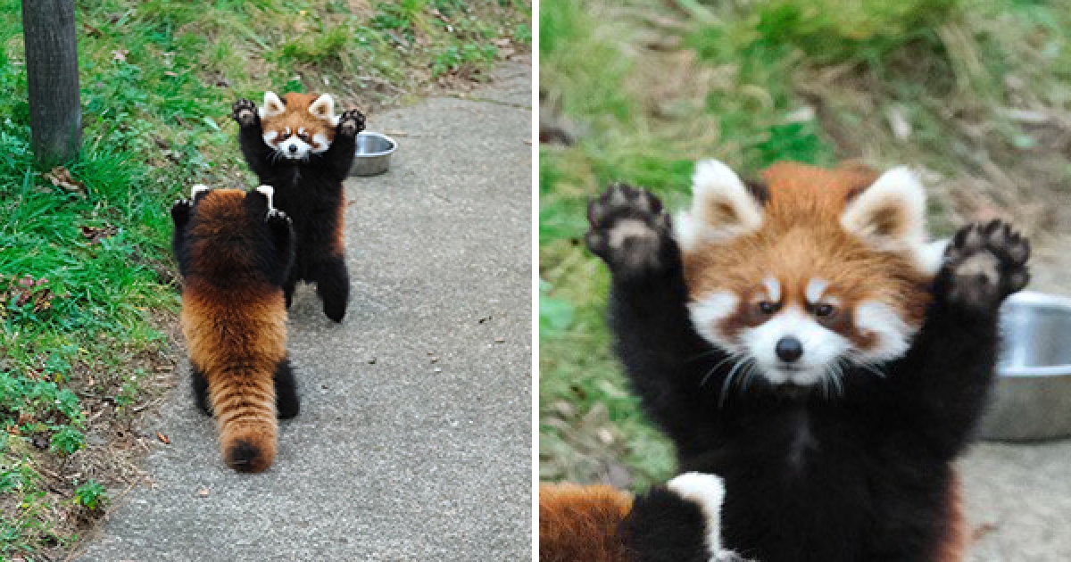 喝! 小熊貓突然「舉手手嚇同伴」 網笑翻:萌到好可怕❤