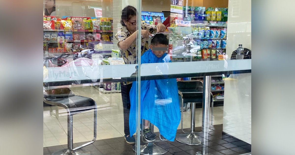 新服務?路過超商驚見大媽「披圍巾幫兒剪髮」 網怒批:恥力無極限!