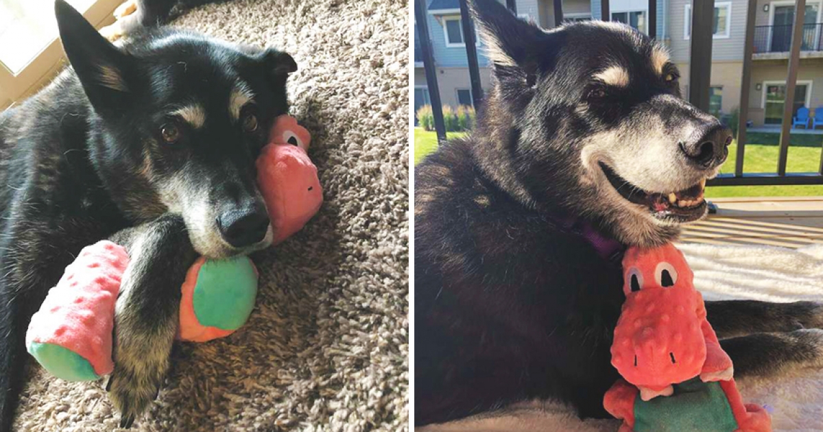 焦慮老狗狗抱緊「粉紅小恐龍」就心安 馬麻笑:從此不再亂咬亂叫