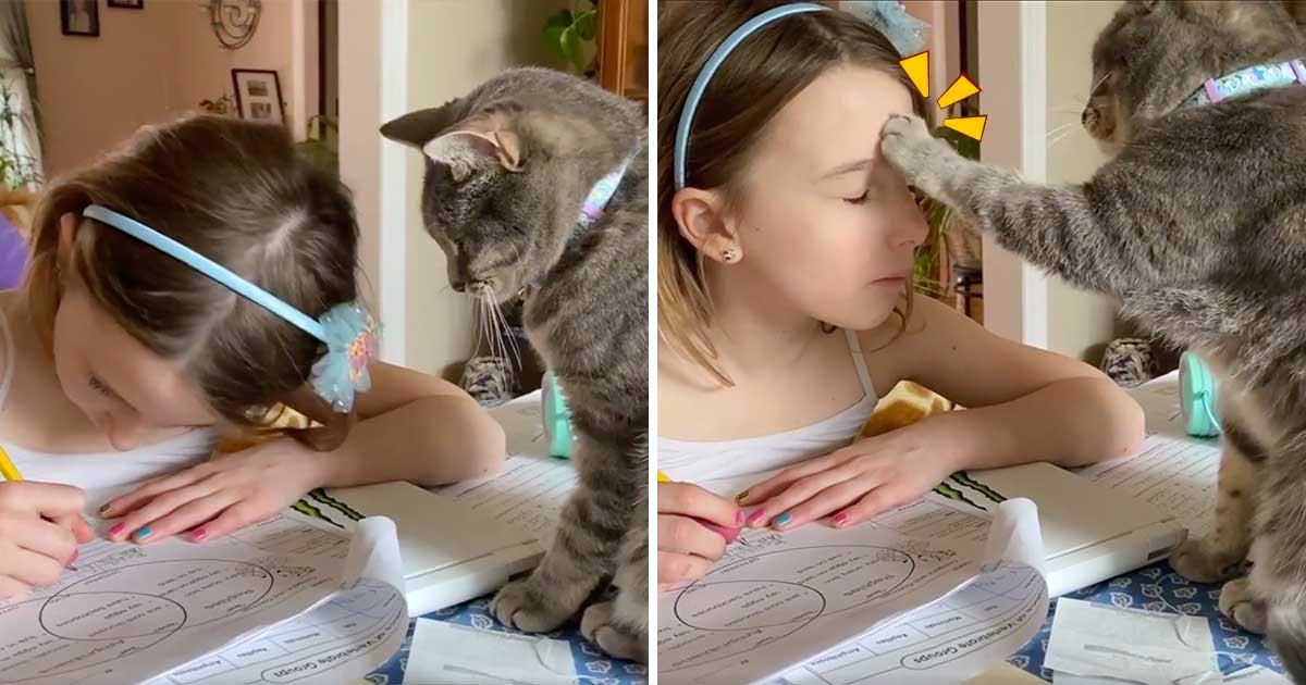 喵的加持!小女孩讀書「貓掌拍頭」以為鼓勵 下秒變臉:我錯了