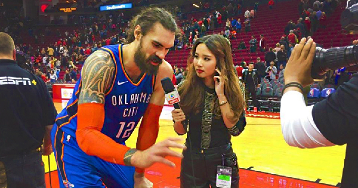 不忍心看正妹記者一直抬頭採訪 213公分「NBA水行俠」貼心彎腰暖翻她的心
