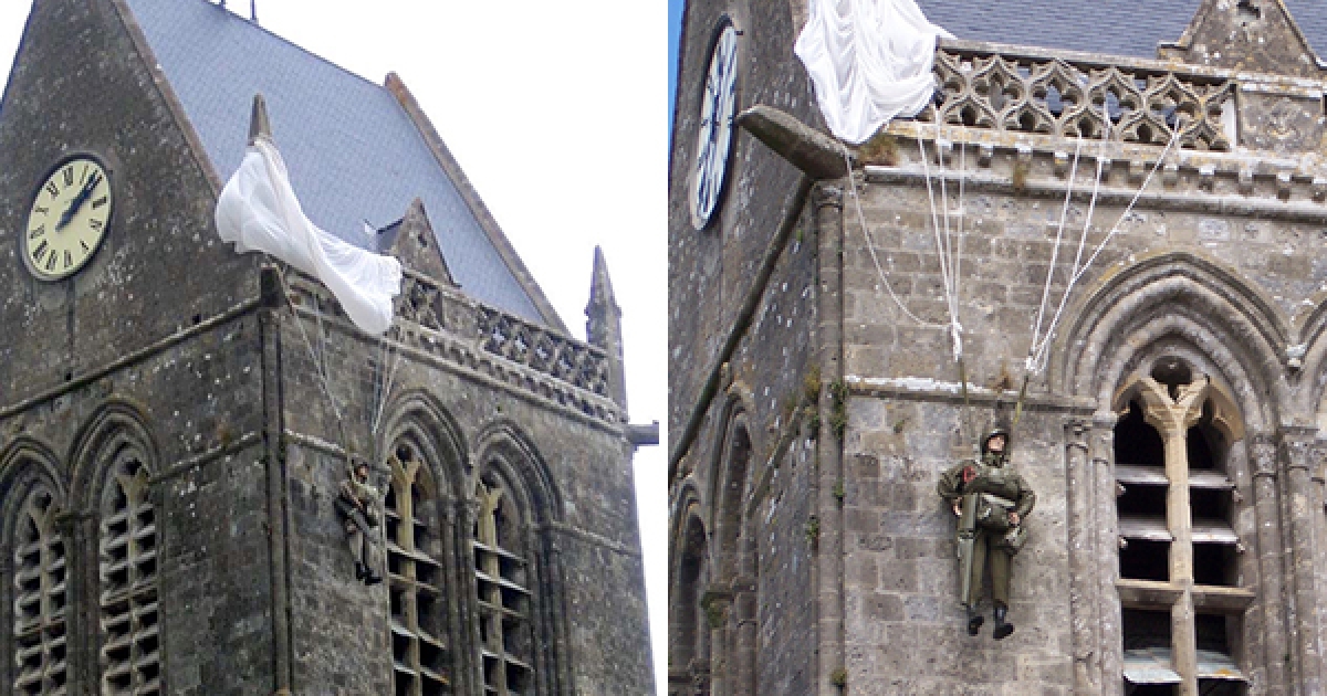 神演技! 傘兵掛教堂屋頂「忙憋氣裝沒命」 當地連掛他74年表揚