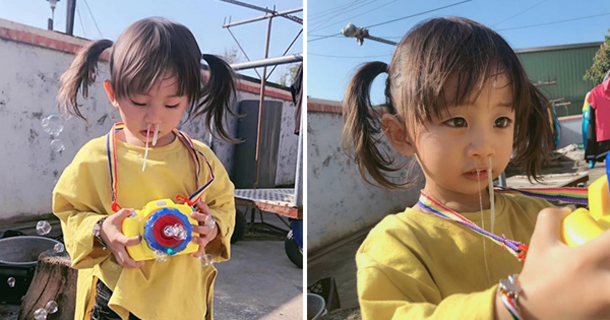 萌妹忘我玩玩具「流出麵條型鼻涕」 媽媽跪求幫修圖…網友暴走了