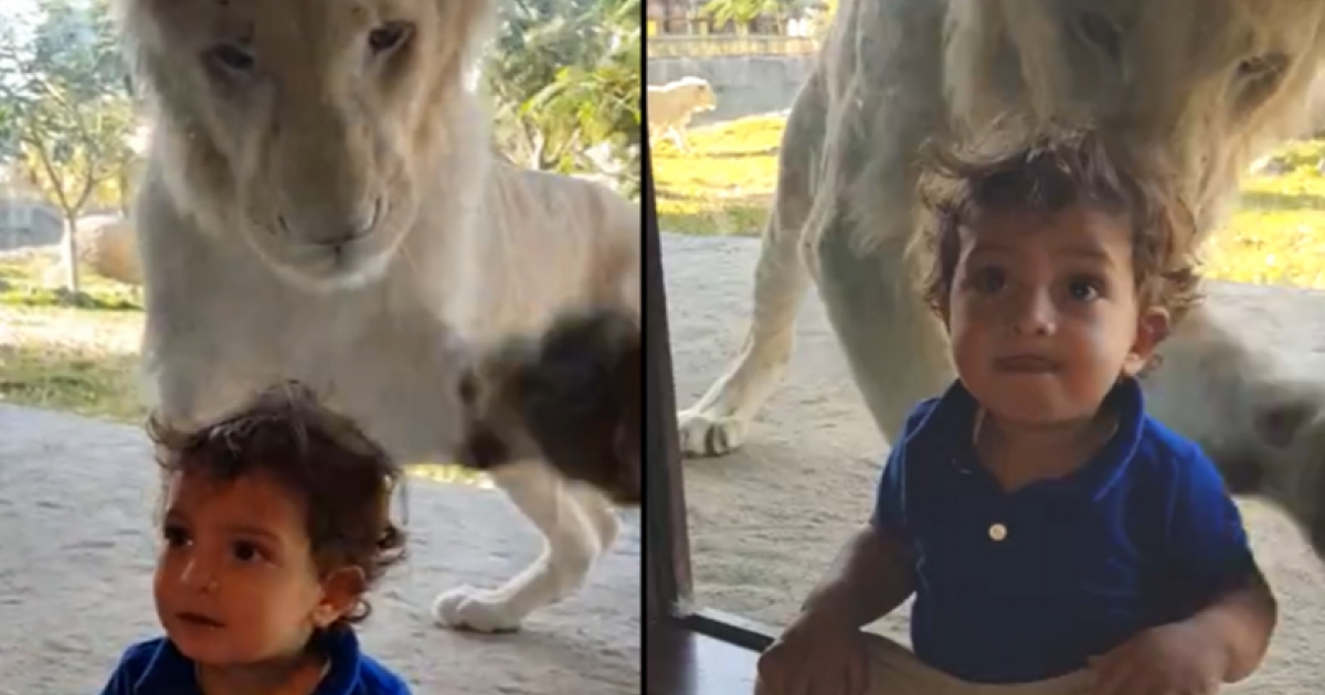 獅子在玻璃牆後一臉飢餓的又抓又舔 小男孩轉身露出「天使微笑」