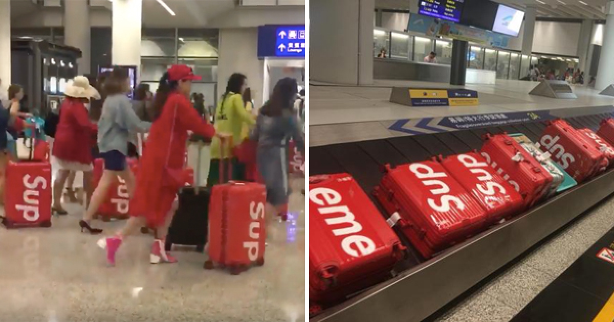 機場驚現中國大媽人手一個「Supreme行李箱」 網友笑:領行李的時候怎麼辦?
