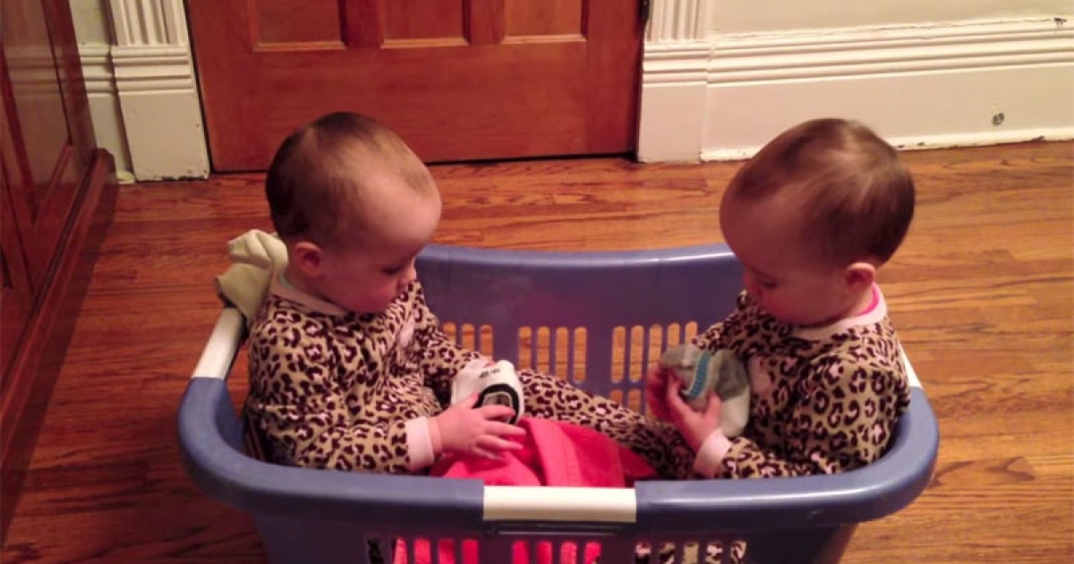 雙胞胎果然有共通語言! 坐洗衣籃開「襪子辯論大會」討論得好認真
