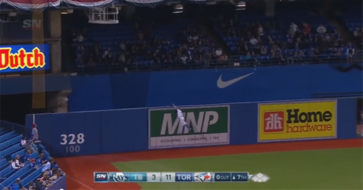 球馬上要飛出全壘打牆外 瞬間變身蜘蛛人神級接殺引全場喝采