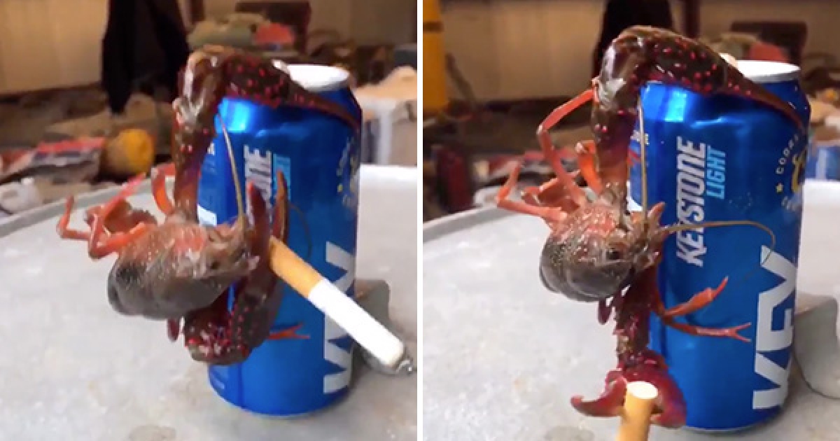 這隻肯定老江湖了 小龍蝦霸佔啤酒「熟練吞雲吐霧」:蝦生啊~