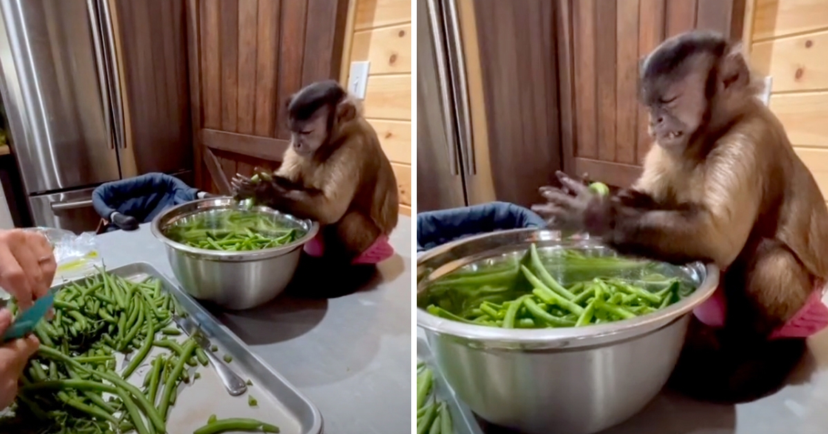 家裡新聘的工讀生?小猴坐桌上「幫媽挑菜」 遇難關滿臉猙獰:看我的!